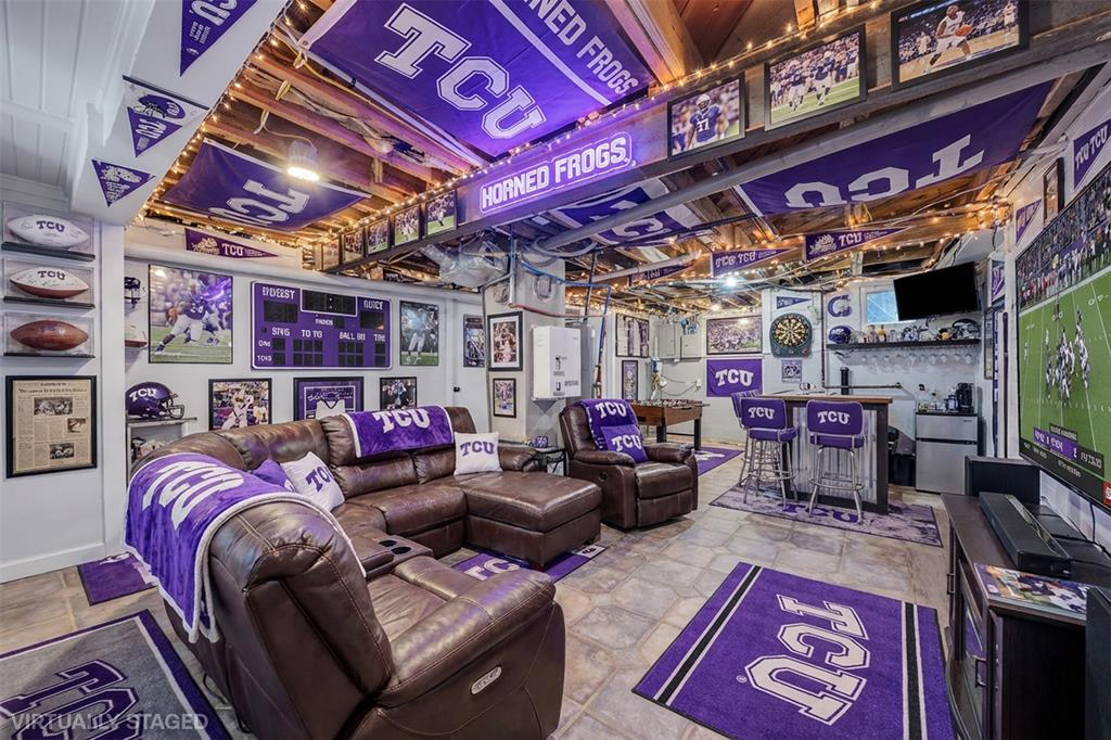 Nestled in the heart of the highly sought-after Bluebonnet Hills neighborhood near TCU, this beautifully maintained historical landmark blends timeless character and modern comfort. Step inside and you’re greeted by glowing, refinished original hardwood floors and cohesive design details that create a warm flow throughout . The front living area—with its gas fireplace—opens effortlessly to the wood-paneled dining room, which connects to the kitchen through a classic two-way swinging door. This thoughtfully designed layout includes three unique bedrooms. The front bedroom features private access to the front patio, while the middle bedroom opens to a charming second-floor balcony, perfect for enjoying morning coffee. The large master suite, located at the back of the home, offers a peaceful retreat with its own private bathroom. This home is ideal for entertaining and relaxation. Aside from the first floor living and dining areas, there is also a large porch outside the kitchen door that leads to an oversized patio downstairs. A finished basement includes two distinct spaces and another full bathroom. One space features a large hot tub and a TV, creating an ultimate space to unwind. The basement is joined to the main floor with an interior staircase and can also be converted into a rental. See pics for more basement ideas. The expansive lot is a standout feature, offering ample room to relax, garden, or play. The backyard showcases an original stone feature, a charming piece of the home’s history that brings unique personality to the space. This feature could be converted back to its original purpose as a pond, or adding a statue or water fountain could make the backyard even more distinctive. Located near Bluebonnet Circle and surrounded by exceptional public and private schools, this home combines rich history, thoughtful design, and a prime location. It’s a rare opportunity to own a piece of history in one of the most desirable neighborhoods in FW!